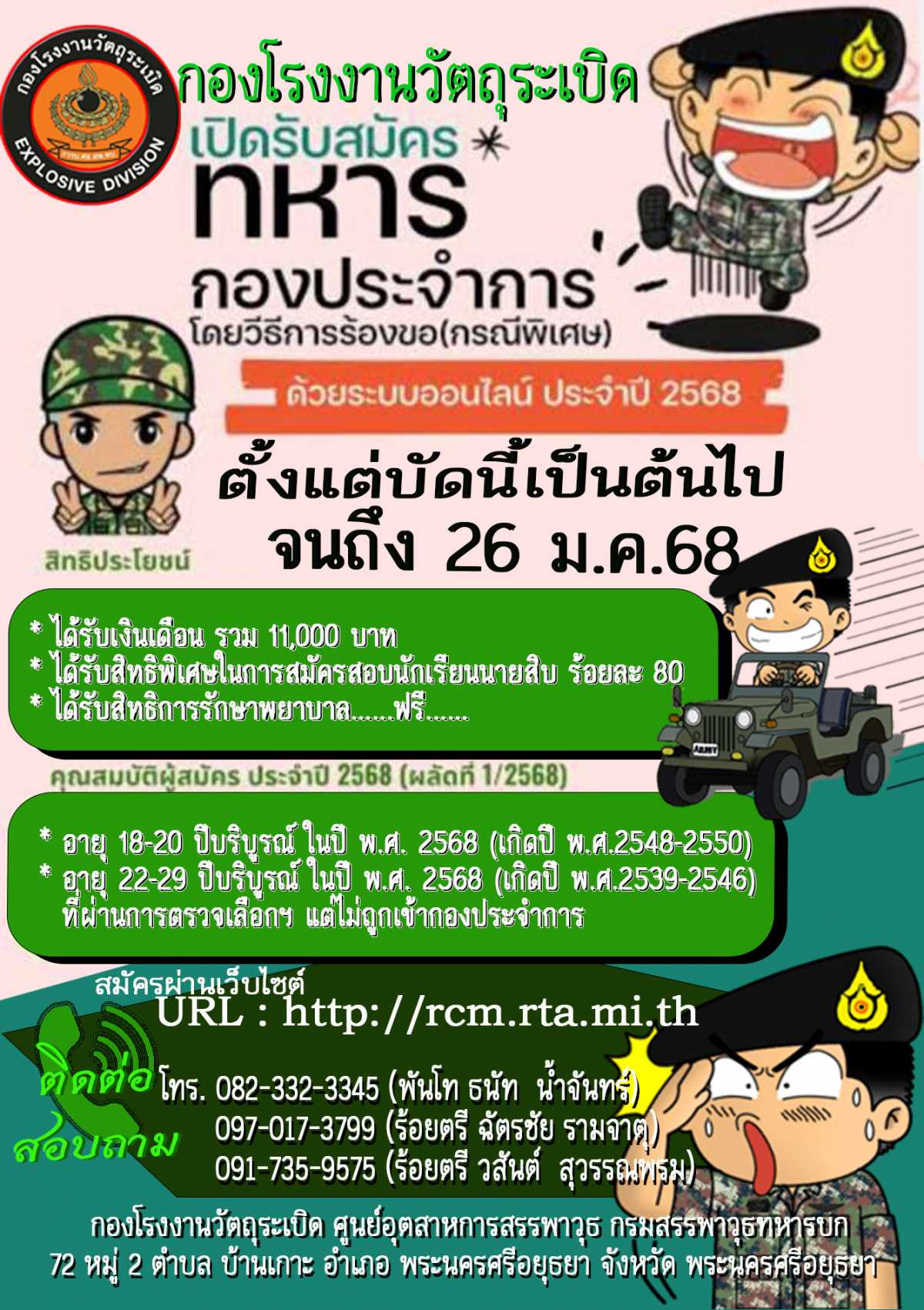 ประชาสัมพันธ์ การรับสมัครทหารกองเกินเข้ารับราชการทหารกองประจำการ โดยวิธีร้องขอ (กรณีพิเศษ) ด้วยระบบออนไลน์ ประจำปี 2568