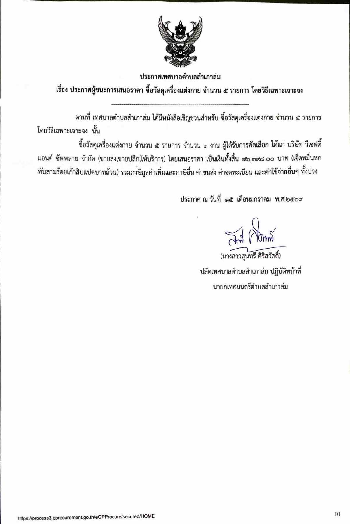 ประกาศผู้ชนะการเสนอราคา ซื้อวัสดุเครื่องแต่งกาย จำนวน ๕ รายการ