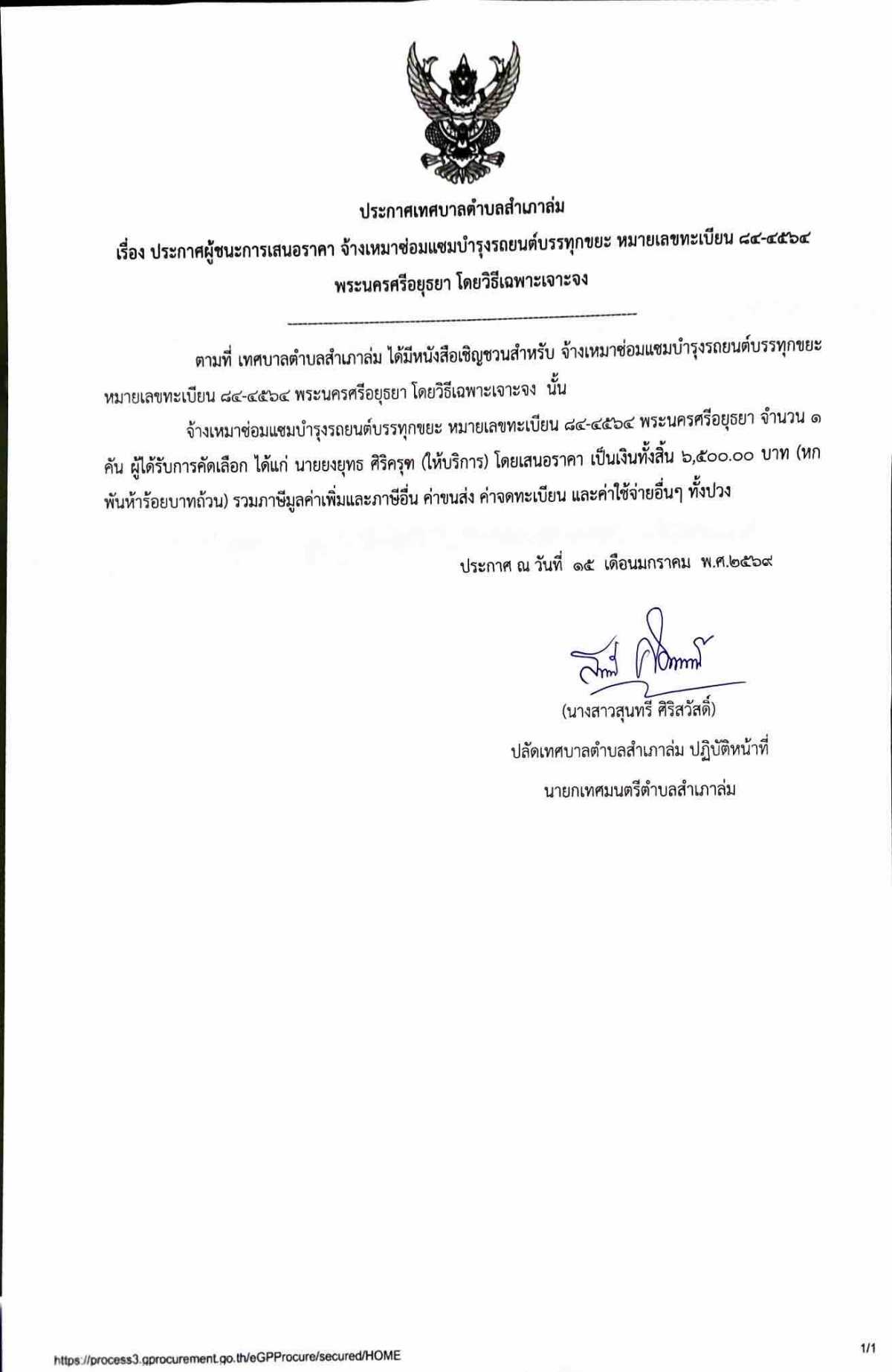 ประกาศผู้ชนะการเสนอราคา จ้างเหมาซ่อมแซมบำรุงรถยนต์บรรทุกขยะ หมายเลขทะเบียน ๘๔-๔๕๖๔ พระนครศรีอยุธยา