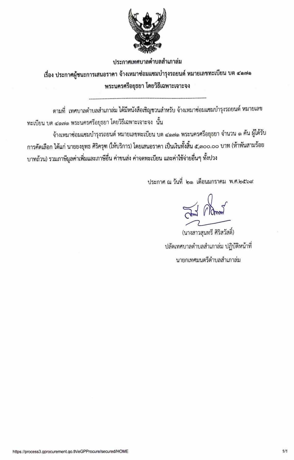 ประกาศผู้ชนะการเสนอราคา จ้างเหมาซ่อมแซมบำรุงรถยนต์ หมายเลขทะเบียน บต ๔๑๗๑ พระนครศรีอยุธยา