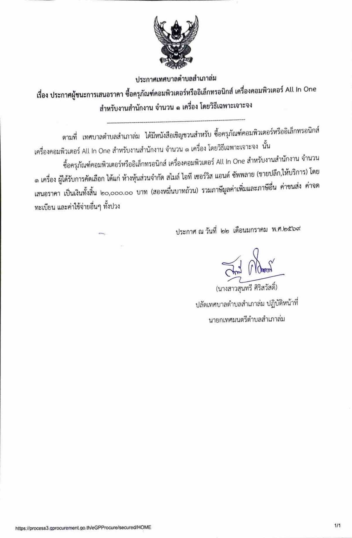 ประกาศผู้ชนะการเสนอราคา ซื้อครุภัณฑ์คอมพิวเตอร์หรืออิเล็กทรอนิกส์ เครื่องคอมพิวเตอร์ All In One สำหรับงานสำนักงาน จำนวน ๑ เครื่อง