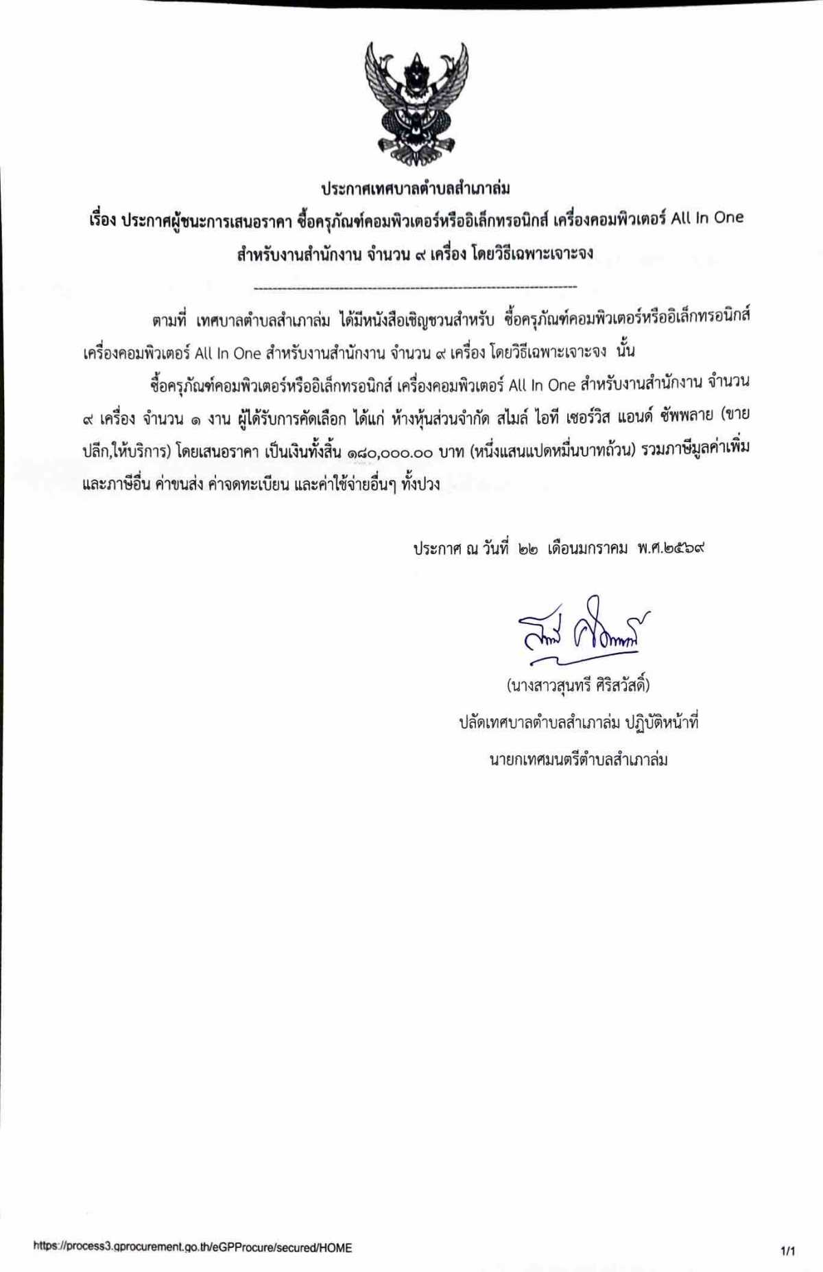 ประกาศผู้ชนะการเสนอราคา ซื้อครุภัณฑ์คอมพิวเตอร์หรืออิเล็กทรอนิกส์ เครื่องคอมพิวเตอร์ All In One สำหรับงานสำนักงาน จำนวน ๙ เครื่อง
