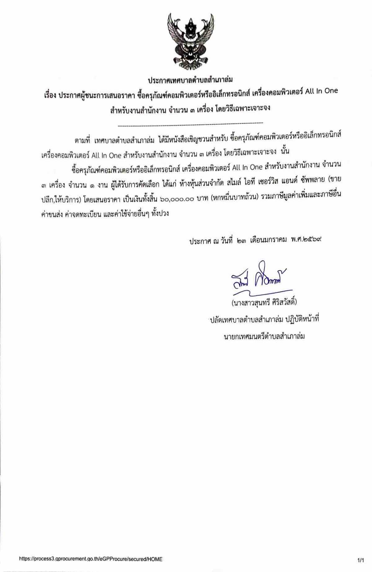 ประกาศผู้ชนะการเสนอราคา ซื้อครุภัณฑ์คอมพิวเตอร์หรืออิเล็กทรอนิกส์ เครื่องคอมพิวเตอร์ All In One สำหรับงานสำนักงาน จำนวน ๓ เครื่อง
