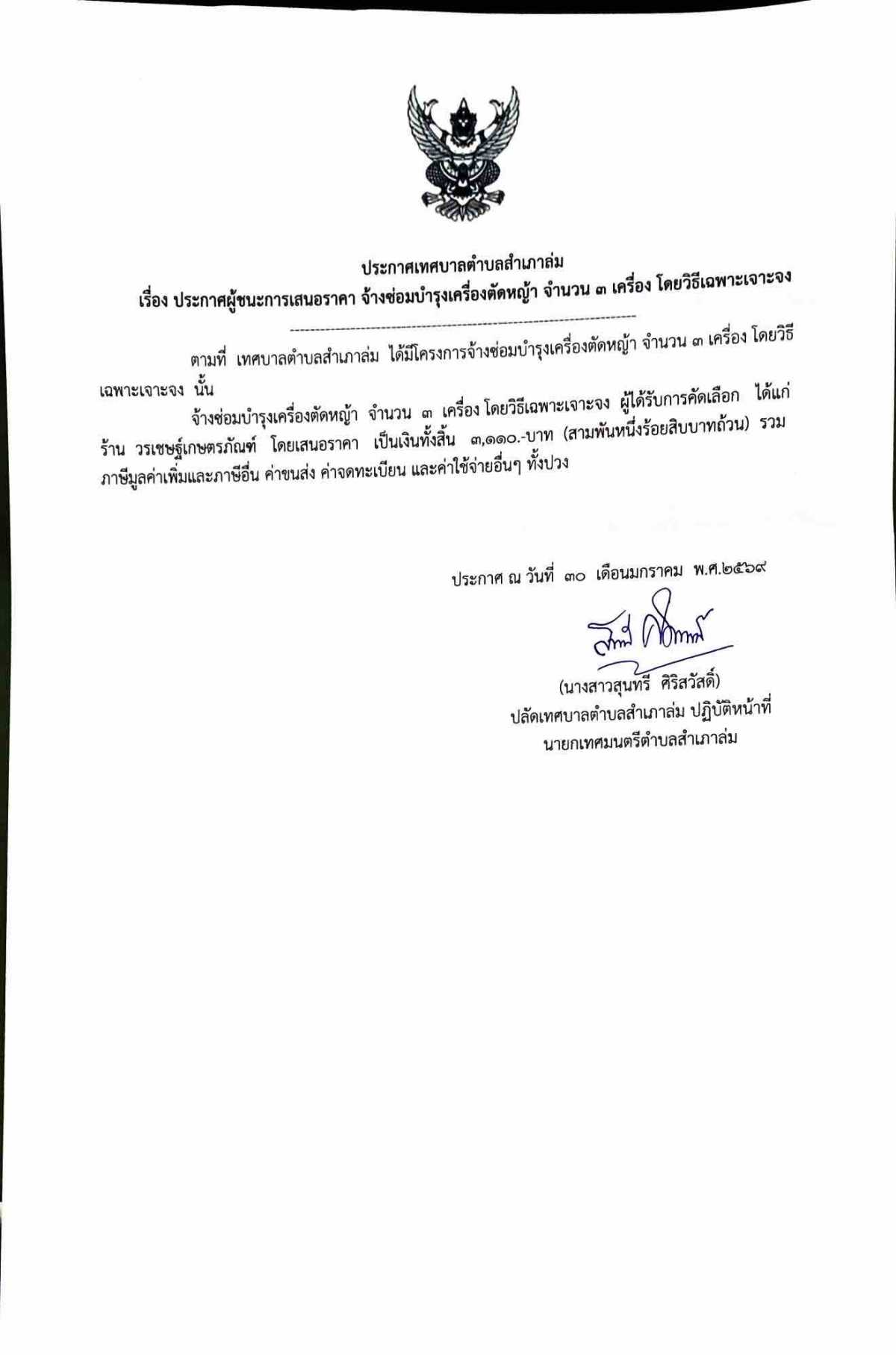 ประกาศผู้ชนะการเสนอราคา จ้างซ่อมบำรุงเครื่องตัดหญ้า จำนวน ๓ เครื่อง