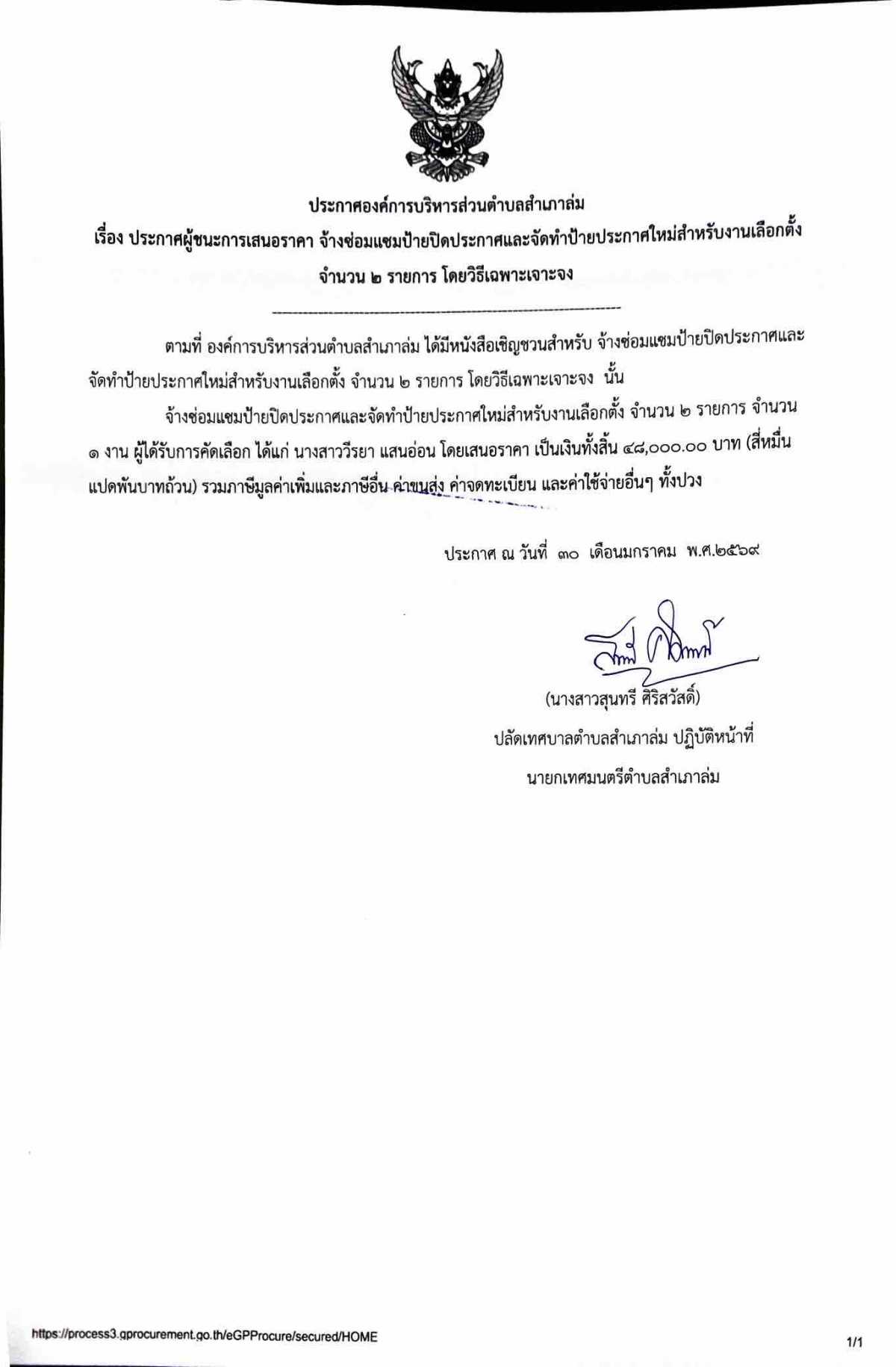 ประกาศผู้ชนะการเสนอราคา จ้างซ่อมแซมป้ายปิดประกาศและจัดทำป้ายประกาศใหม่สำหรับงานเลือกตั้ง จำนวน 2 รายการ