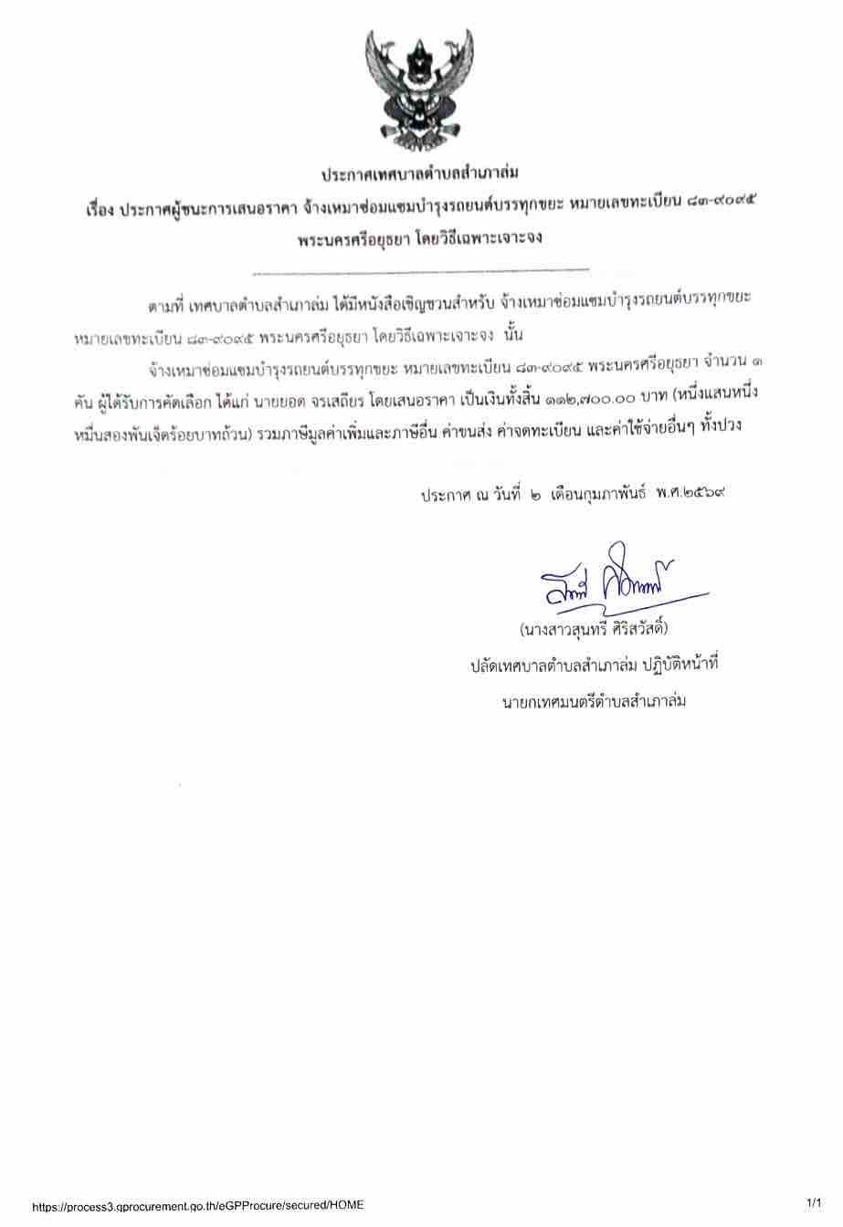 ประกาศผู้ชนะการเสนอราคา จ้างเหมาซ่อมแซมบำรุงรถยนต์บรรทุกขยะ หมายเลขทะเบียน ๘๓-๙๐๙๕ พระนครศรีอยุธยา