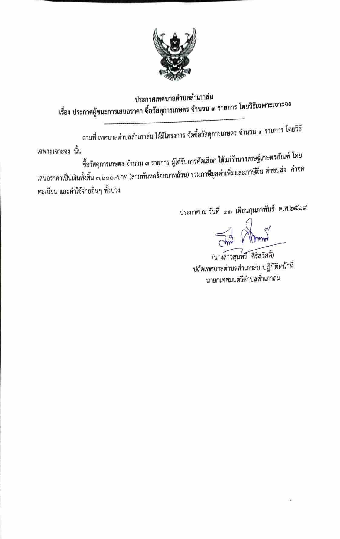 ประกาศผู้ชนะการเสนอราคา ซื้อวัสดุการเกษตร จำนวน ๓ รายการ