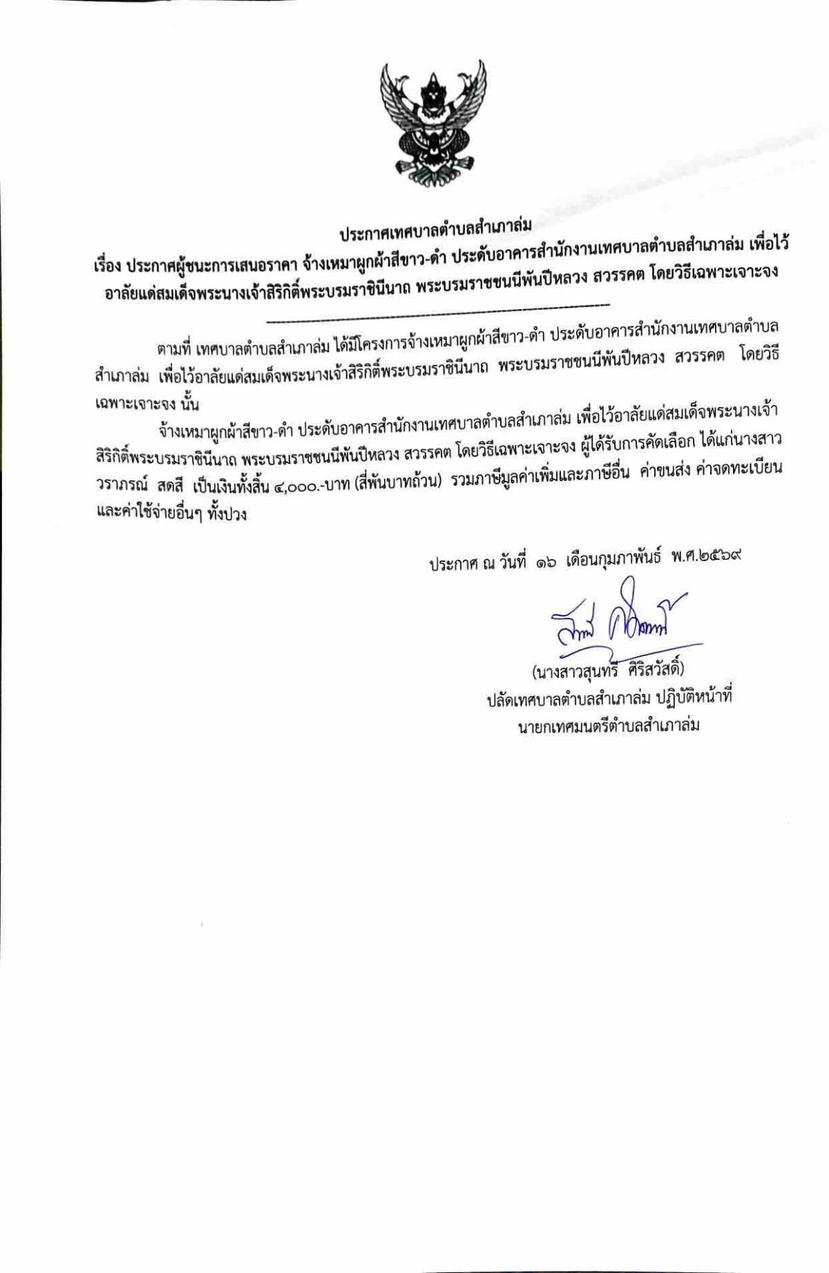 ประกาศผู้ชนะการเสนอราคาจ้างเหมาผูกผ้าสีขาว-ดำ ประดับอาคารสำนักงานเทศบาลตำบลสำเภาล่ม เพื่อไว้อาลัยแด่สมเด็จพระนางเจ้าสิริกิติ์พระบรมราชินีนาถ พระบรมราชชนนีพันปีหลวง สวรรคต