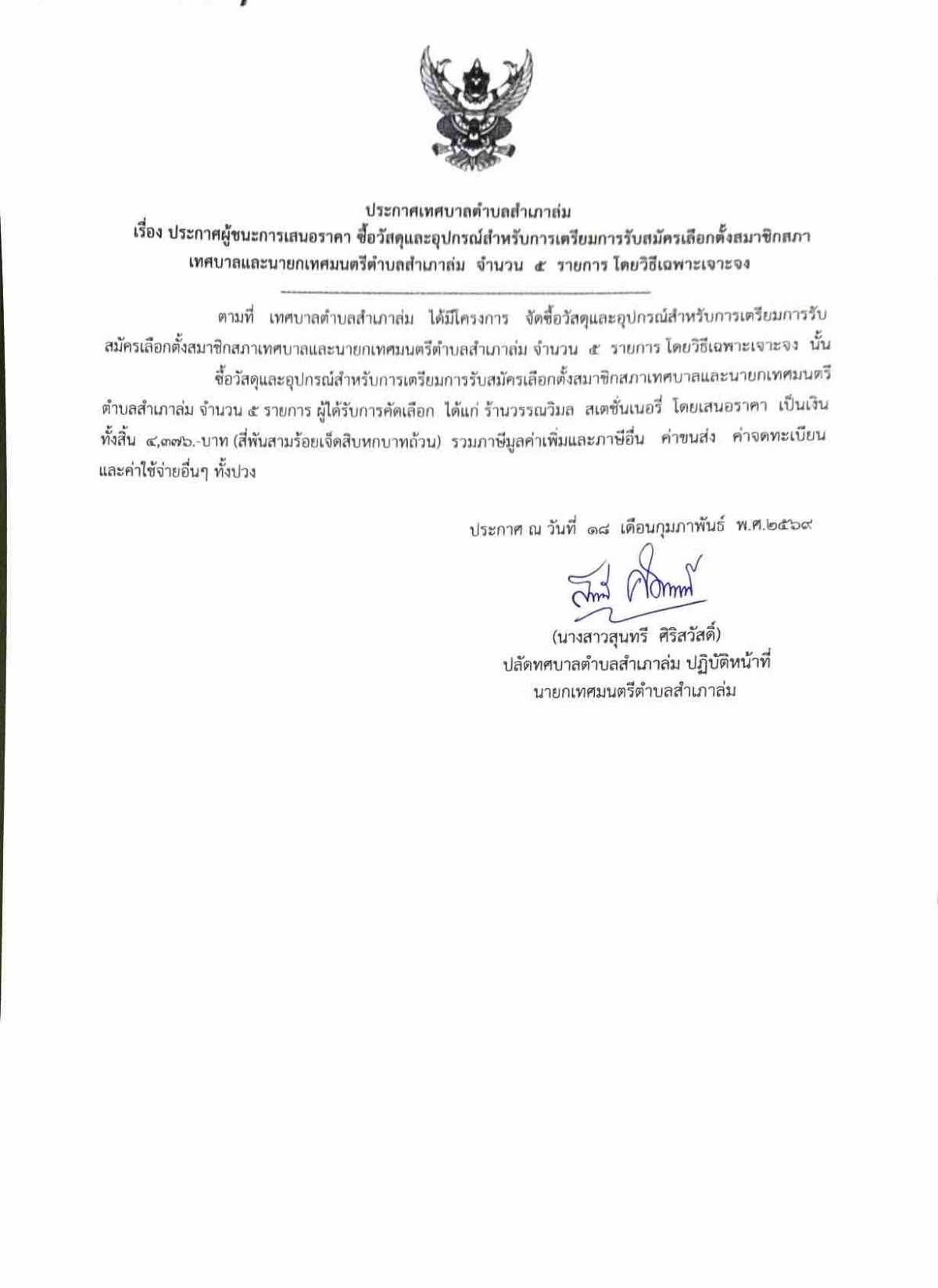 ประกาศผู้ชนะการเสนอราคาซื้อวัสดุและอุปกรณ์สำหรับการเตรียมการรับสมัครเลือกตั้งสมาชิกสภาเทศบาลและนายกเทศมนตรีตำบลสำเภาล่ม จำนวน ๕ รายการ