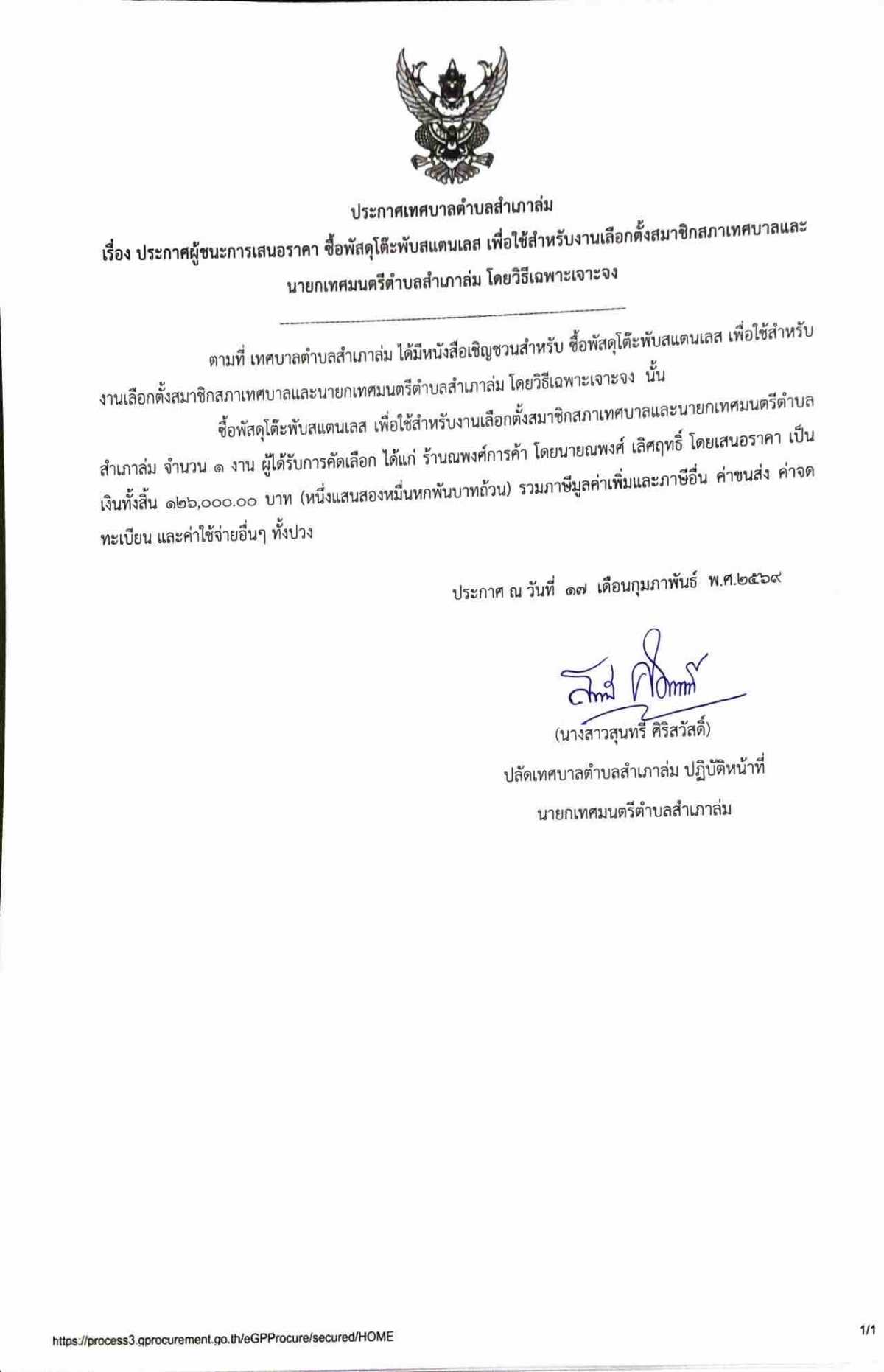 ประกาศผู้ชนะการเสนอราคาซื้อพัสดุโต๊ะพับสแตนเลส เพื่อใช้สำหรับงานเลือกตั้งสมาชิกสภาเทศบาลและนายกเทศมนตรีตำบลสำเภาล่ม