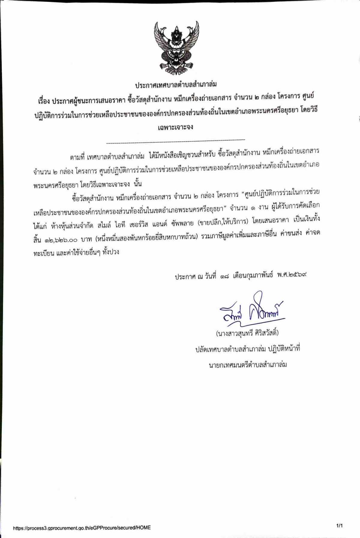 แจ้งผลการจัดซื้อจัดจ้าง ประกวดราคาซื้อตามโครงการติดตั้งระบบเสียงไร้สายในเขตองค์การบริหารส่วนตำบลสำเภาล่ม ด้วยวิธีประกวดราคาอิเล็กทรอนิกส์ (e-bidding)