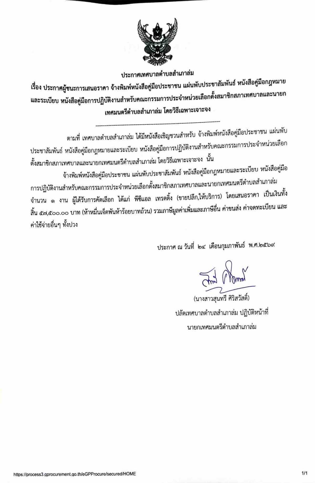 ประกาศผู้ชนะการเสนอราคาจ้างพิมพ์หนังสือคู่มือประชาชน แผ่นพับประชาสัมพันธ์ หนังสือคู่มือกฎหมายและระเบียบ หนังสือคู่มือการปฏิบัติงานสำหรับคณะกรรมการประจำหน่วยเลือกตั้งสมาชิกสภาเทศบาลและนายกเทศมนตรีตำบล สำเภาล่ม