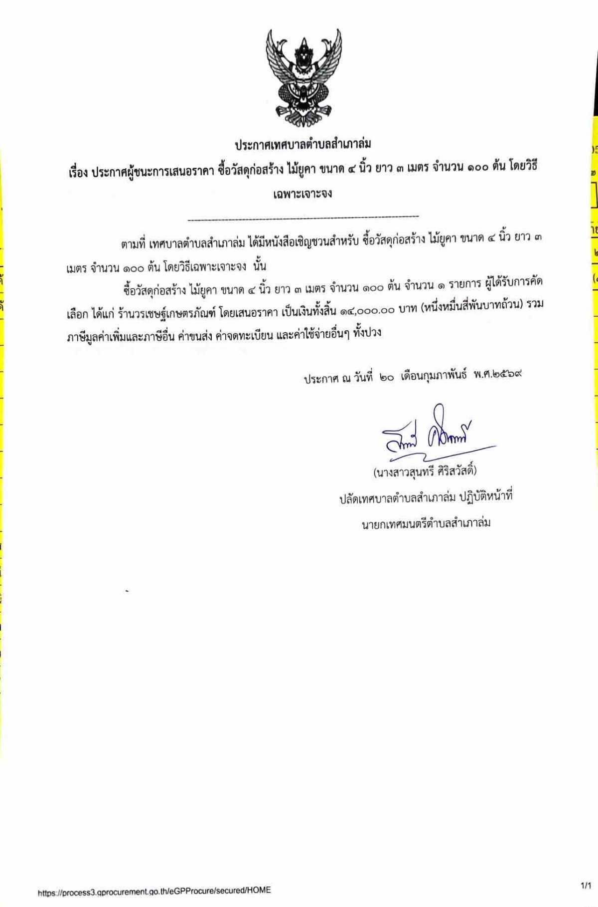 ประกาศผู้ชนะการเสนอราคาซื้อวัสดุก่อสร้าง ไม้ยูคา ขนาด ๔ นิ้ว ยาว ๓ เมตร จำนวน ๑๐๐ ต้น