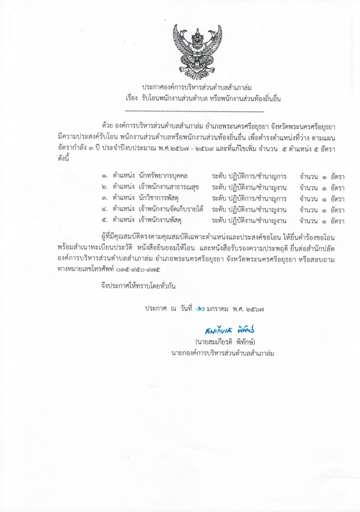 ประกาศ รับโอนพนักงานส่วนตำบล จำนวน 5 ตำแหน่ง 5 อัตรา