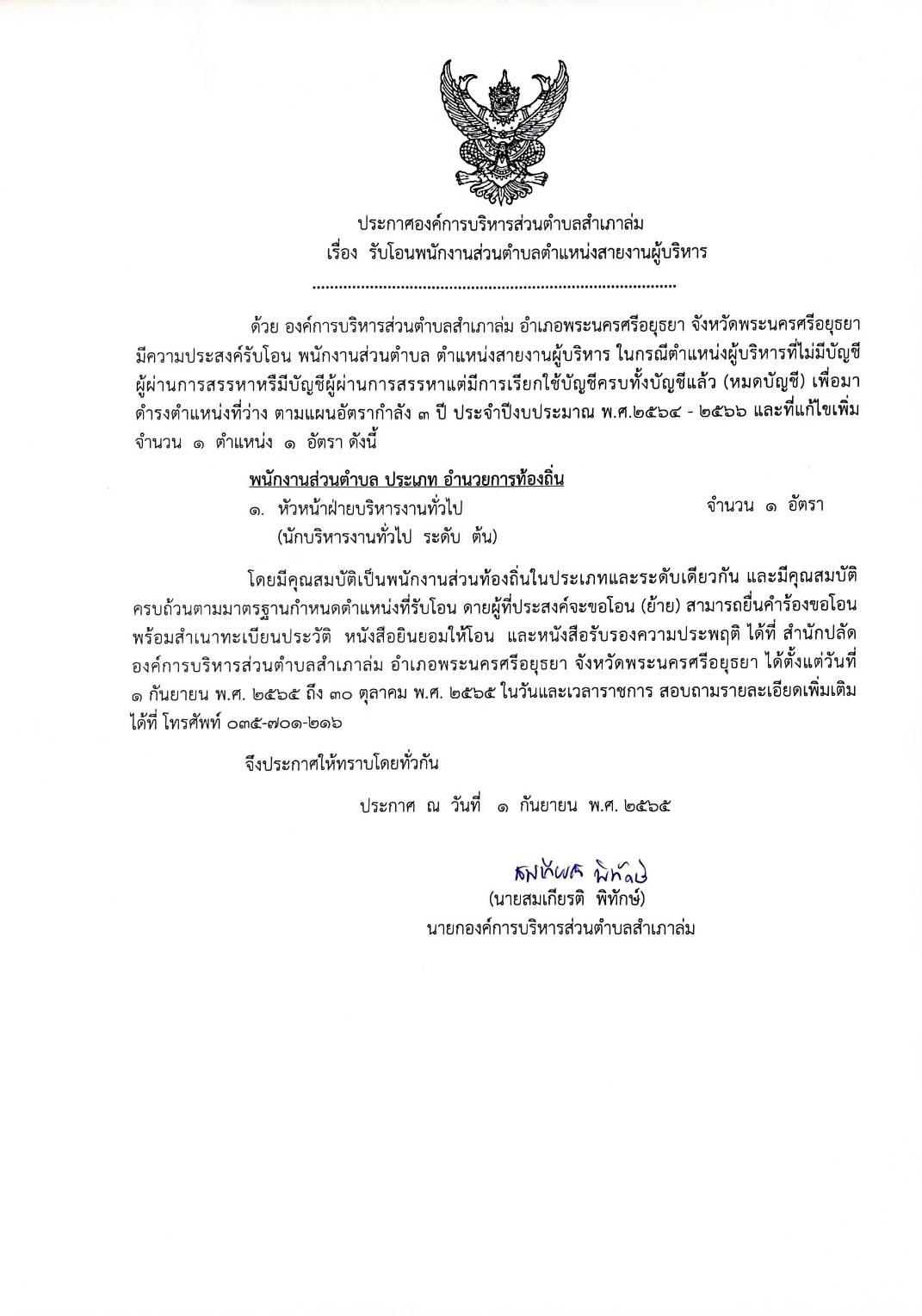 ประกาศ รับโอนพนักงานส่วนท้องถิ่น ตำแหน่งสายงานผู้บริหาร จำนวน 1 ตำแหน่ง 1 อัตรา